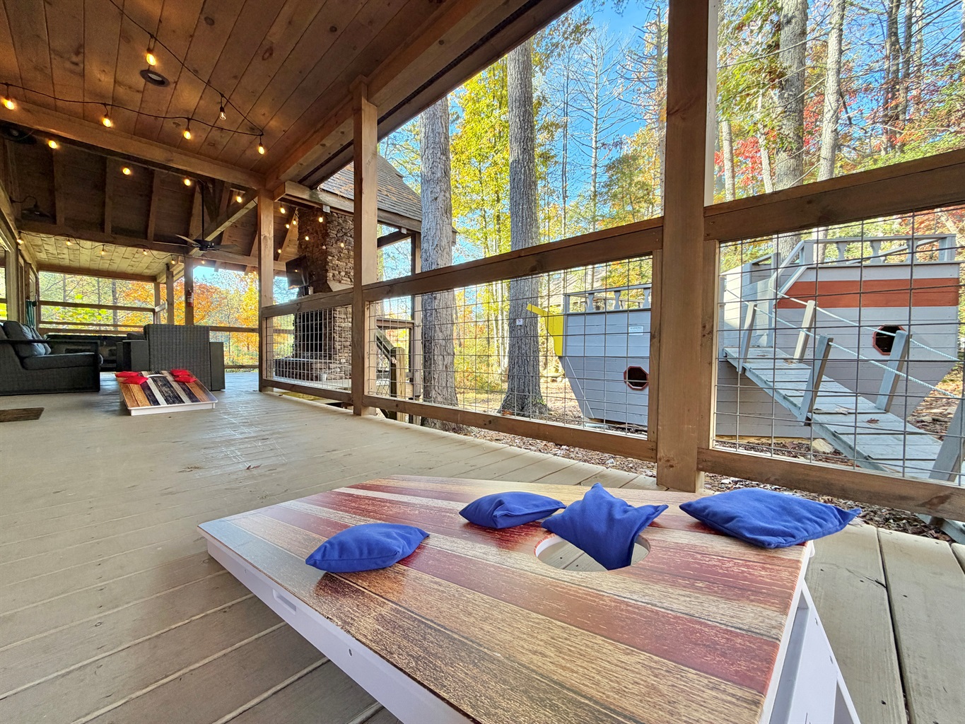 Fire up the charcoal grill right off the porch for nightly barbecues. Kids will love the ship playhouse. The deck wood fireplace area is perfect for relaxing and conversation. There’s even an outdoor Roku TV.