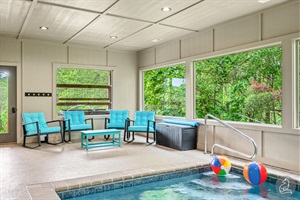 Relax in the hot tub or enjoy the indoor 10'5" x 20 ft pool (pool heater set at 82˚F NOT BATHTUB WARM). It has a locked keypad entry for safety. Pool has a dedicated bathroom! House and pool towels provided. Fire up the charcoal grill right off the porch for nightly barbecues. Kids will love the pirate ship playhouse. The deck *electric* fireplace area is perfect for relaxing and conversation. There's even an outdoor Roku TV.